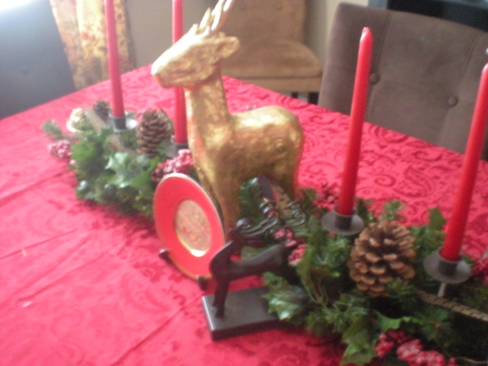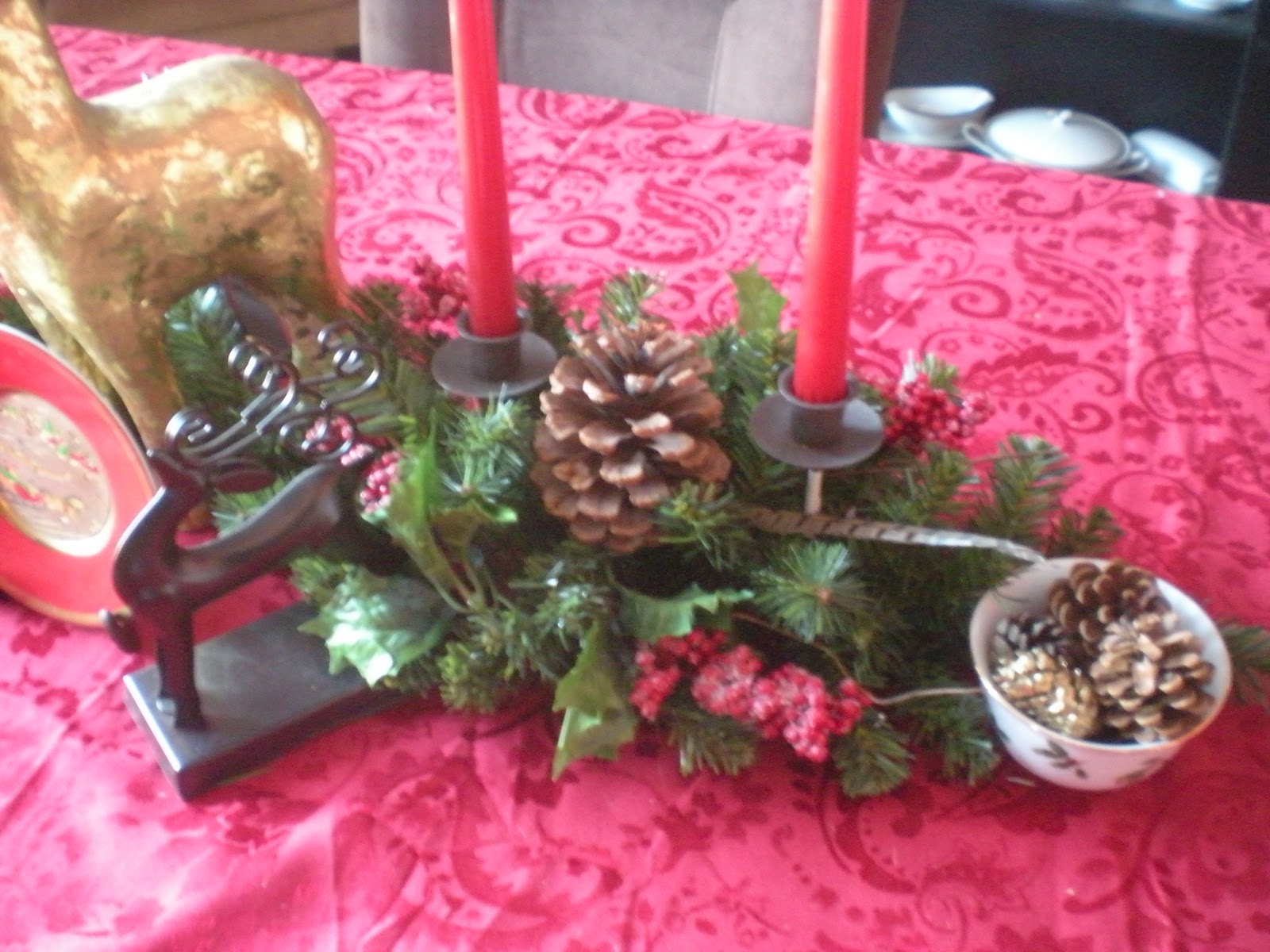 Here is the decor in our dining room. Majority of the decorations I have had for several years and a few were bought at Kohls two Christmas's ago. This year my decor consist of, holly, feathers, pine cones, twigs, and burlap garland; with other things mixed in.