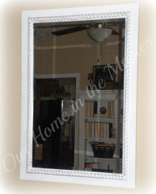 Fast forward to two weeks ago...........While I was working on my burlap tables; I decided to make some changes in the family room. The first thing I did was paint this mirror from black to white: