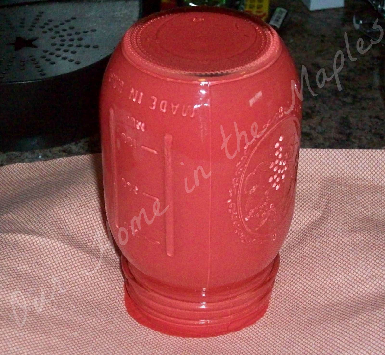 The red mason jars, which will be used in the dining room, were worked on while the bottles were cooking and draining. When I mixed up the red I just kind of winged it. I cannot tell you how many drops of red food coloring I used, I just kept adding until the mixture looked right. After making sure the jars were covered thoroughly I let them sit upside down for a little over two hours.