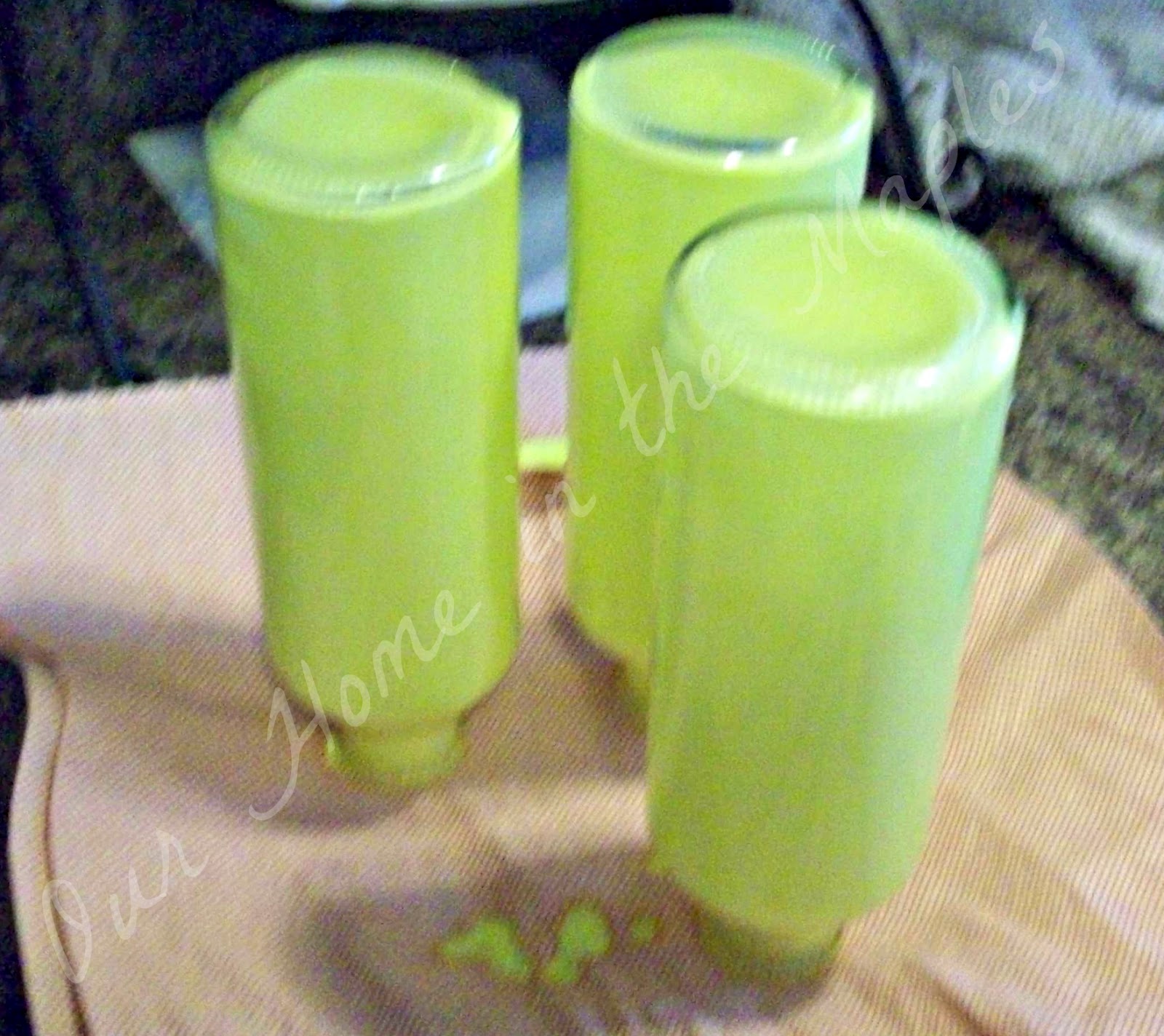 The first step was to wash and dry the jars & bottles thoroughly. Then I had to decide what colors I would use. For the bottles, I decided to use yellow and green, since those two colors are in the family room curtains.