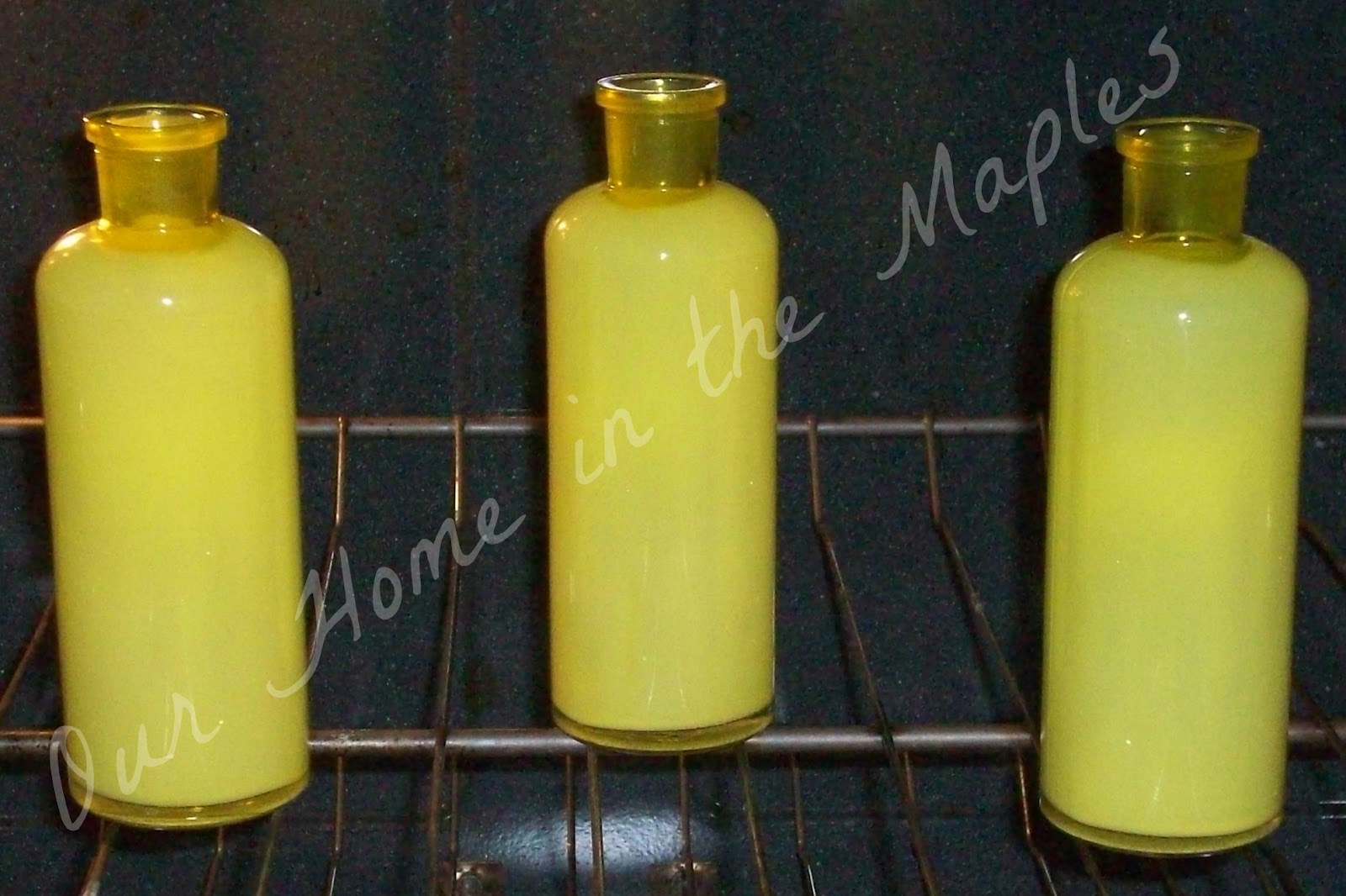 Once the 30 minutes was up, I removed the bottle from the paper towels and wiped any excess mixture of the rim and place them in the oven. *Now this is where I discovered that you should make your tint mixture either very water or they need to drain a lot longer than 30 minutes.